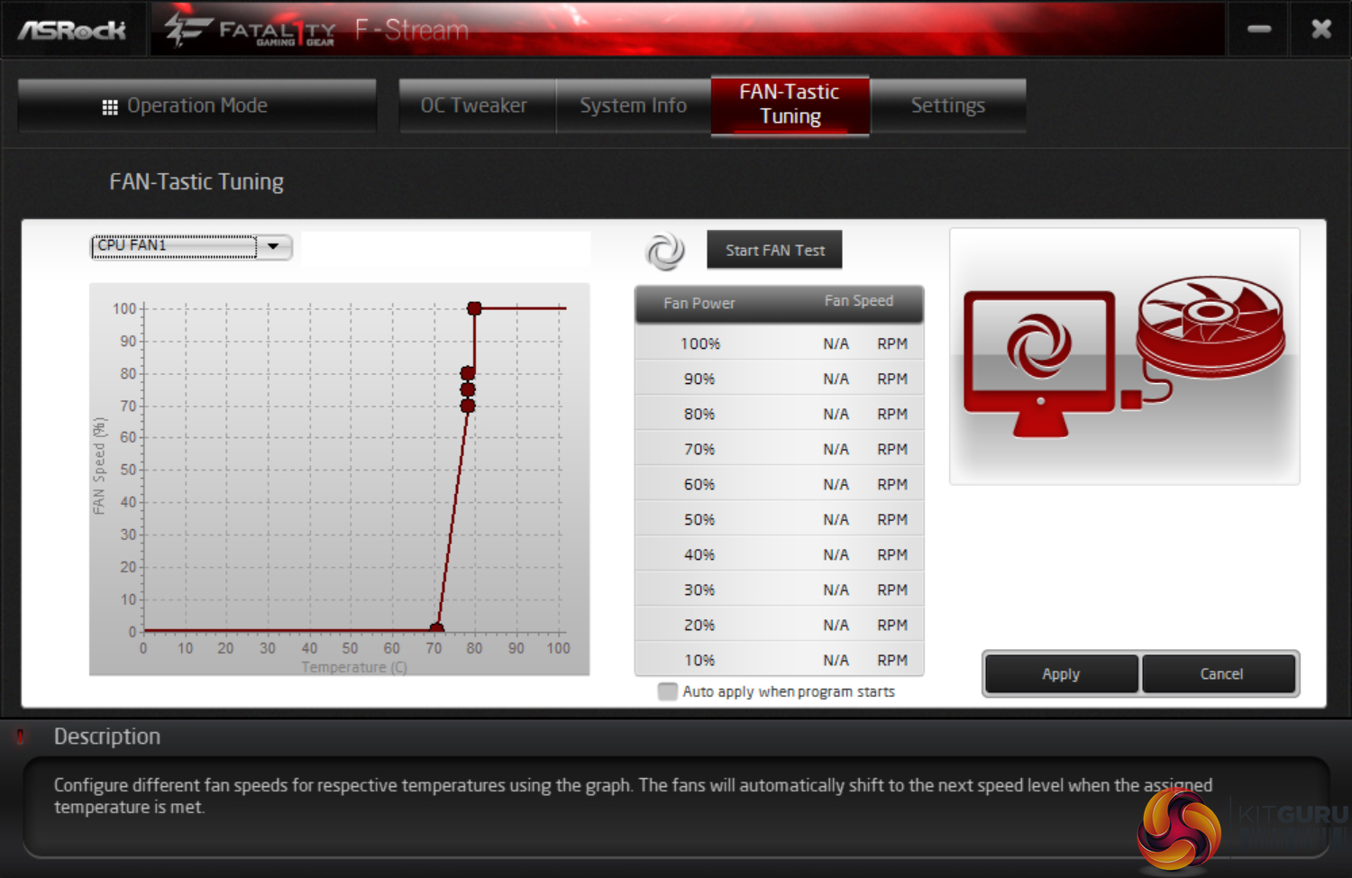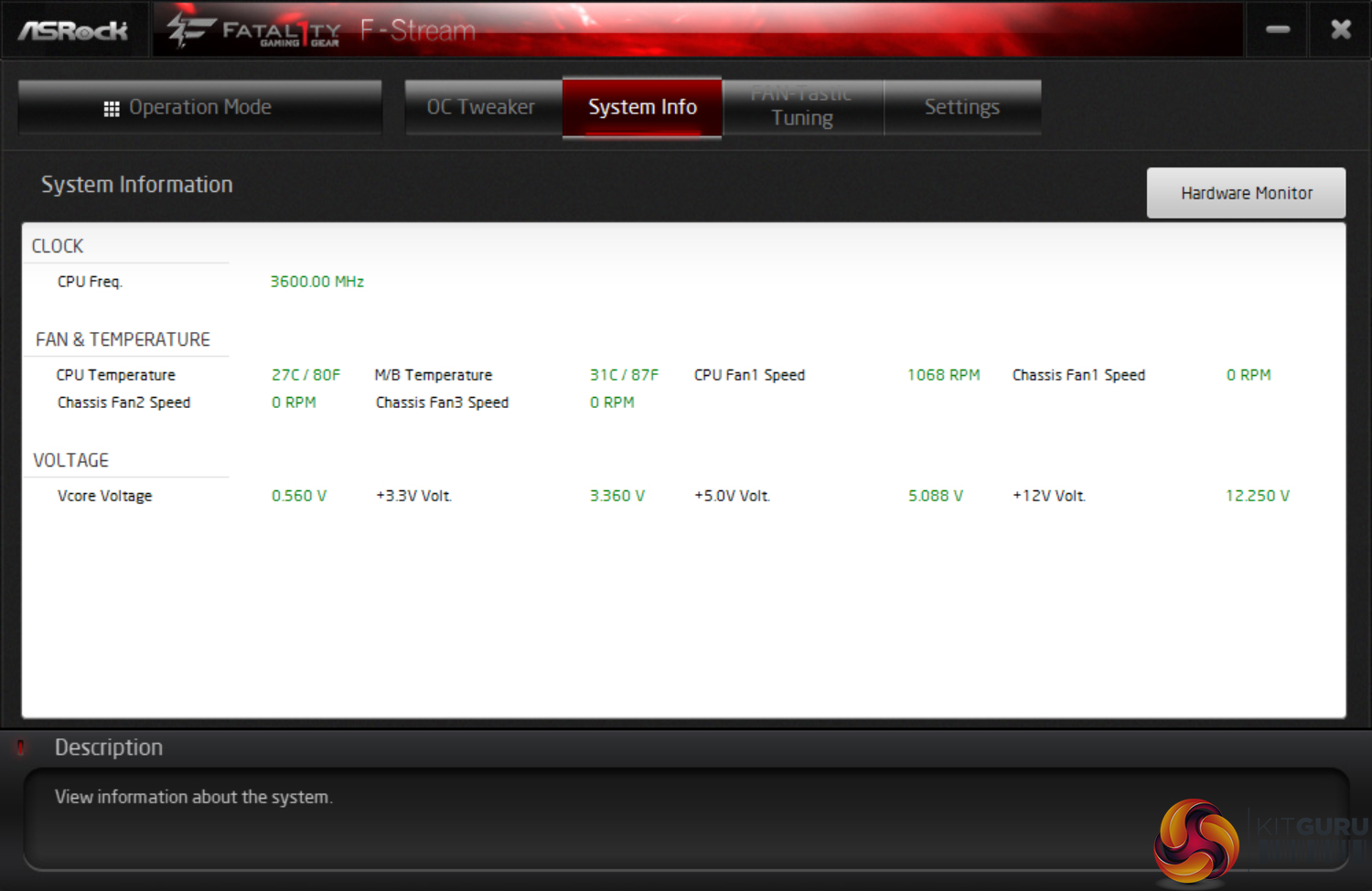 F-Stream, as it is referred to on Fatal1ty motherboards (A-Tuning for other product lines), is ASRock’s equivalent to ASUS AI Suite, Gigabyte EasyTune, and MSI Command Centre. This software allows you to overclock on the fly (OTF) and tune the fan speeds in real time with the ASRock Fan-Tastic tuning utility. It’s a reasonably well-polished piece of software, is light on system resources, and not very intrusive.