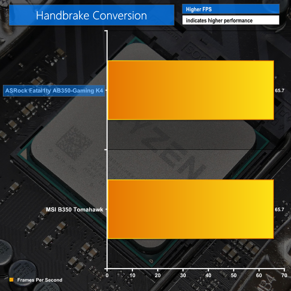 Handbrake is a free and open-source video transcoding tool that can be used to convert video files between different codecs, formats and resolutions. We measured the average frame rate achieved for a task of converting a 6.27GB 4K video using the Normal Profile setting and MP4 container. The test stresses all CPU cores to 100% and shows an affinity for memory bandwidth.
