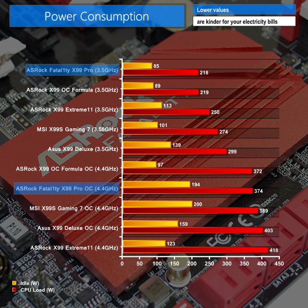 The ASRock Fatal1ty X99 Professional motherboard shows excellent power consumption numbers at stock clocks, especially when idling. Turning up the voltage and applying an overclock changes the situation.