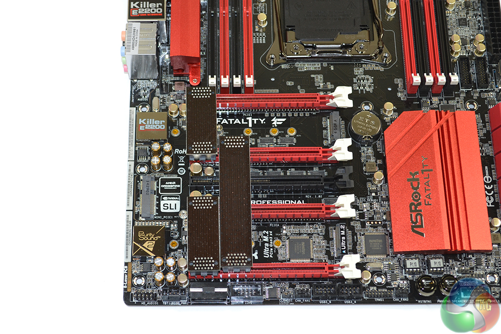 Three screws are used for the pair of M.2 connectors and the mini-PCIe slot. The rear IO shield is colour coded and features pre-positioned holes for three antennas should users decide to install an internal WiFi card. ASRock supplies four rigid SLI bridges which aren’t quite pure black – they’re a dark brown.