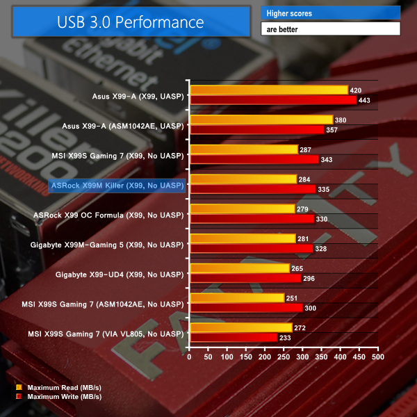 ASRock's USB 3.0 implementation is faster than many of its competitors' applications of the X99-fed SuperSpeed ports. Still, without a valid UASP-activating tool for Windows 7 users, the ASRock ports cannot match the sequential transfer rates set by Asus' solutions and their accompanying USB 3.0 Boost (UASP) software.