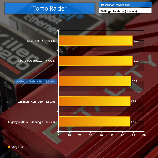 Gamers will be pleased by the strong frame rates set by ASRock's X99M Killer in Metro: Last Light and Bioshock Infinite. Tomb Raider proves a little less favourable on the ASRock board, demoting it to third place in the performance hierarchy and opening a 1.3 frame deficit over the Asus and MSI leaders.