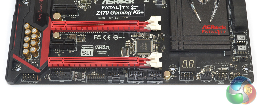 Expansion slots for ASRock's Fatal1ty Z170 Gaming K6+ follow the typical design that we expect to see from an upper-mid-range, gaming-orientated Z170 motherboard. Two-card SLI and three-card CrossFire is supported. ASRock's slot spacing is as good as it gets for an ATX board with dual-card usage in mind, and placement of the Ultra M.2 slot allows an ugly green SSD to be hidden by the graphics card above, albeit while receiving extra heat.