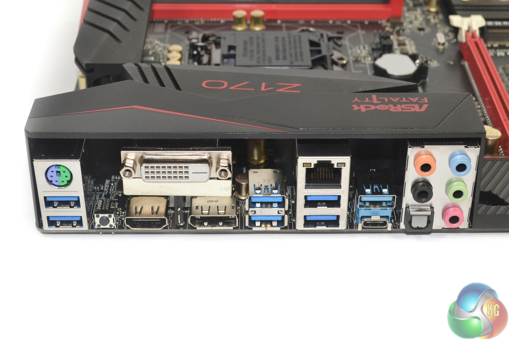 A total of six USB 3.0 ports are found in the rear IO section, all of which stem from the Z170 chipset. One of these connectors doubles up to form ASRock's Fatal1ty mouse port that features enhanced control adjustments through OS-based software. ASMedia's ASM1142 chipset feeds the pair of USB 3.1 ports, while an EtronTech EJ179V switch makes the reversible Type-C USB 3.1 connector physically possible.
