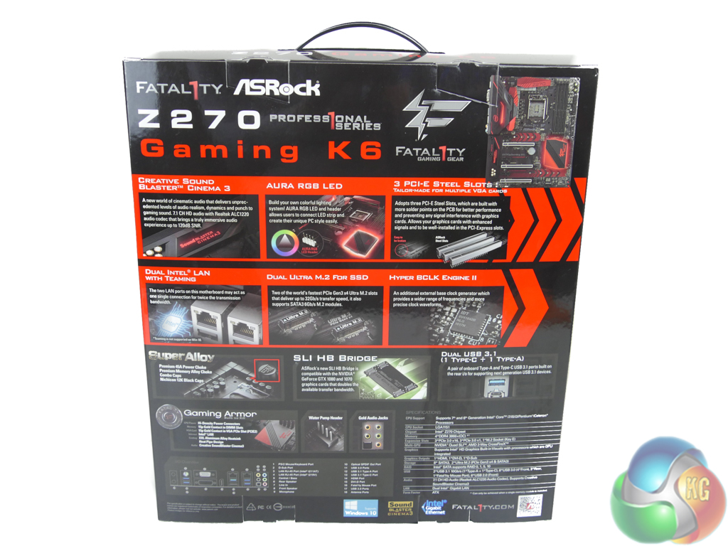 ASRock ships the Z270 Gaming K6 in packaging typical for the company’s Fatal1ty series of motherboards. Red and black colouring steals the show and a detailed infographic of specifications and features is found on the box’s rear side.