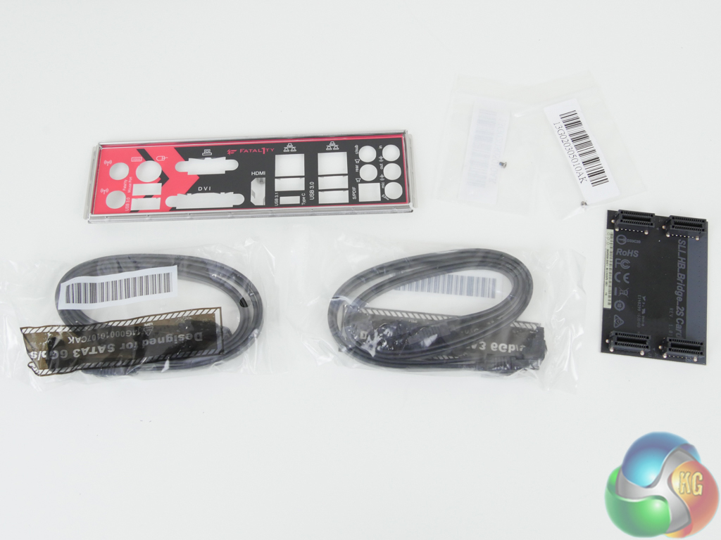 A basic bundle is formed of four SATA cables, two very small screws for each M.2 slot, a labelled rear IO shield, and a high-bandwidth rigid SLI bridge.