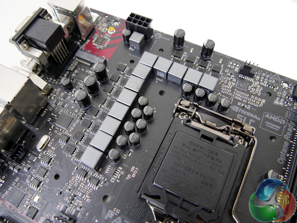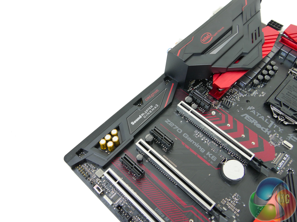 Hidden beneath the RGB LED-equipped plastic shroud is the audio system. The 120dB-rated SNR Realtek ALC1220 codec is used at the heart of the audio system. A Texas Instruments NE5532 amplifier, aided by five 100 microFarad (10V) Nichicon Fine Gold capacitors, boosts the audio signal. Creative Sound Blaster Cinema 3 software-based processing is supported.