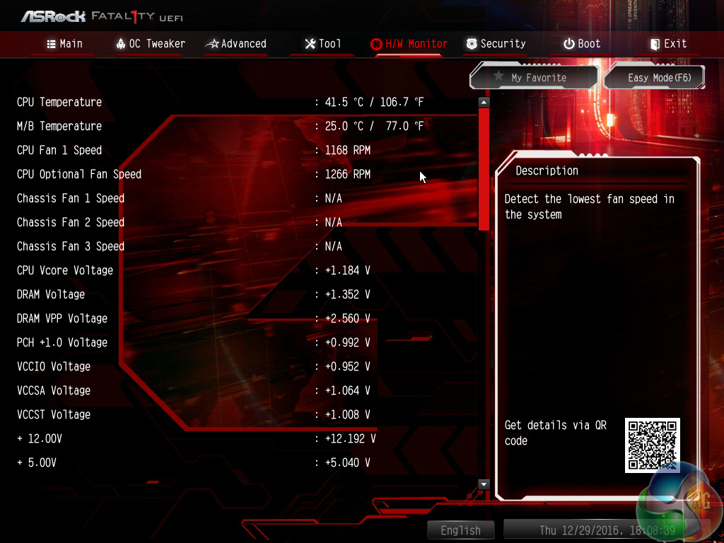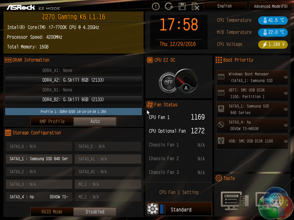 ASRock’s UEFI opens into the EZ Mode page which displays relevant information such as the fan speeds, boot device priority, and operating temperatures. This section has limited ability but can be used to control XMP, use the CPU EZ OC feature, and change the fan speed setting.