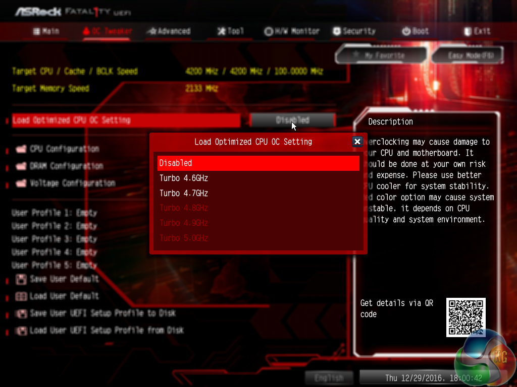 Five CPU overclocking presets are saved in the UEFI. These go from a 4.6GHz CPU frequency up to 5.0GHz in 100MHz intervals. Given that these presets are designed to work with a variety of CPUs, their voltage optimisation is limited and not specific to your chip (which may scale well or poorly with voltage and frequency).