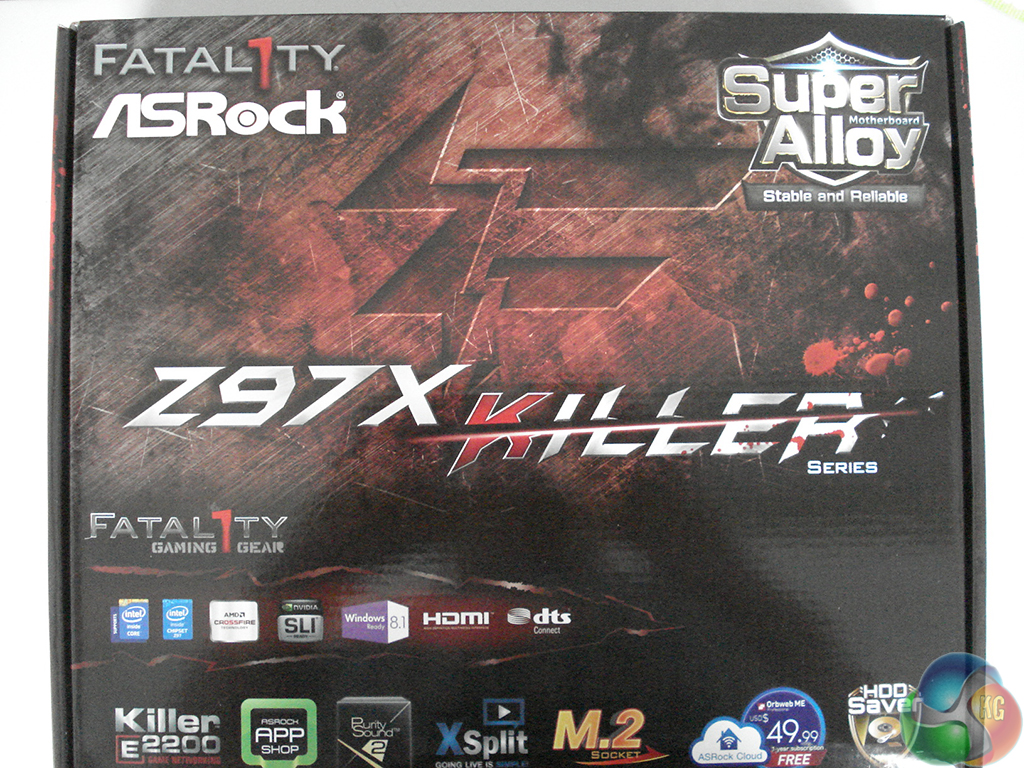 The front of the Z97X Killer motherboard's box outlines a number of the key features, including the Killer E2200 NIC, M.2 connector, and XSplit license.