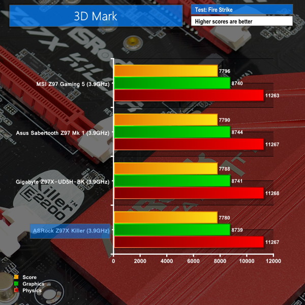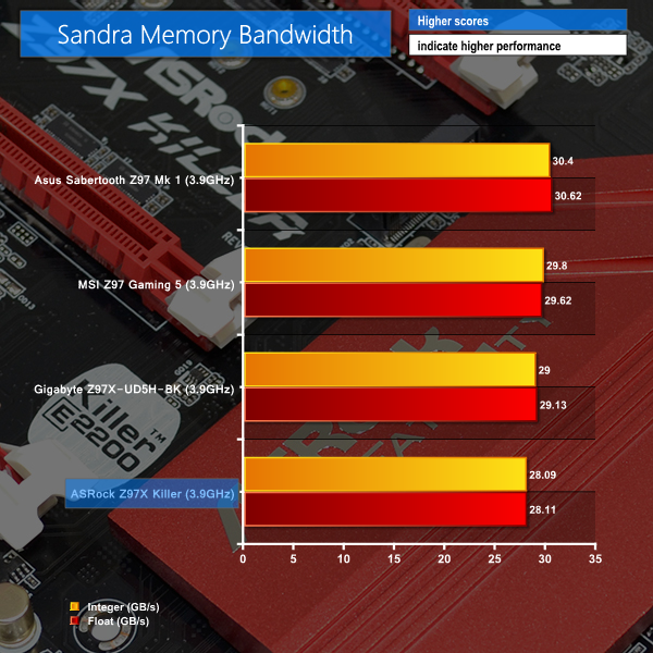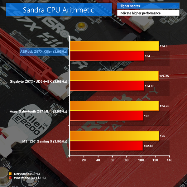 Performance of ASRock's Z97X Killer varies from test to test. The CPU arithmetic score is high, while 3DMark and memory bandwidth scores sit ASRock's board at the bottom of the pile.