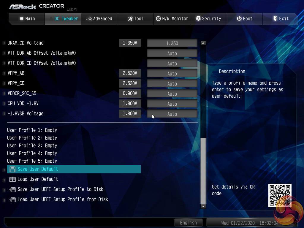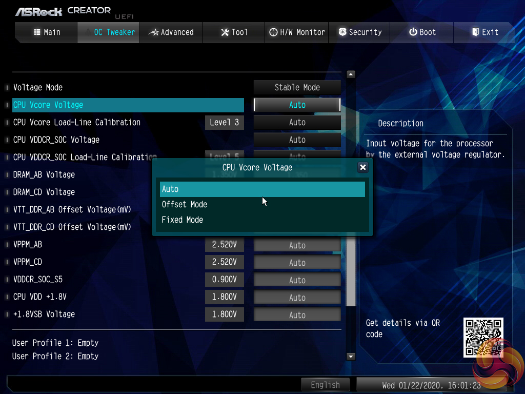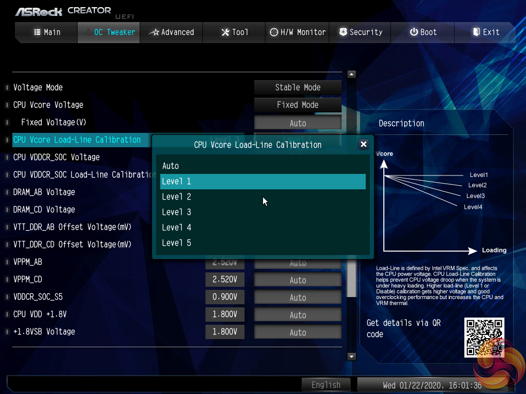 The OC Tweaker section is good in terms of the options and granularity the user has to tune their hardware. The voltage number input seems to be using a switch to red text when voltage levels that are high and risky have been entered. ASRock’s system for allowing a user to manage loadline calibration is very good as the options are clearly displayed using a graph.