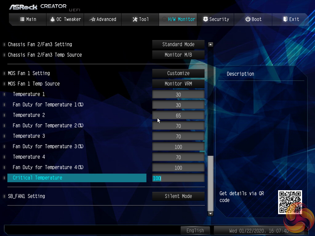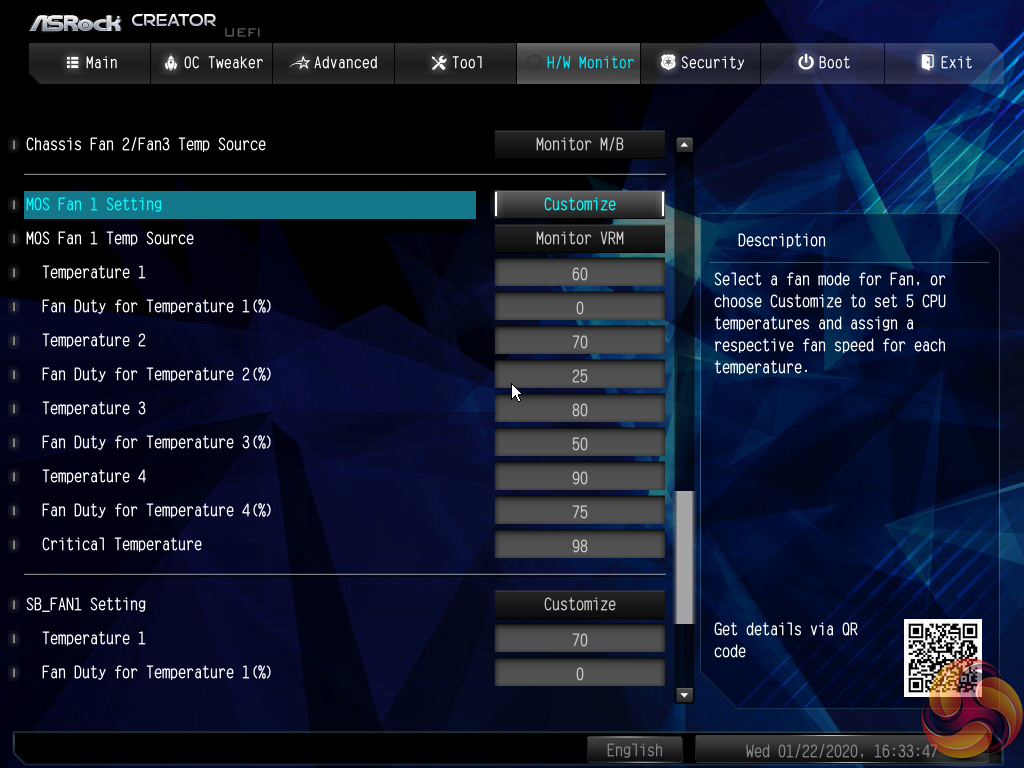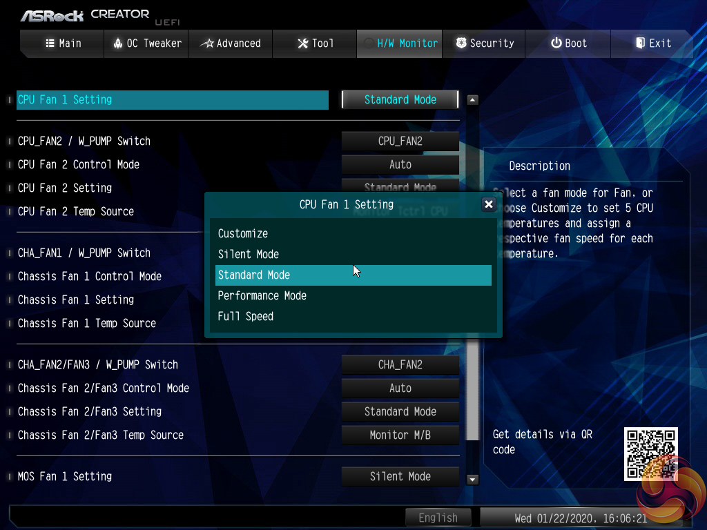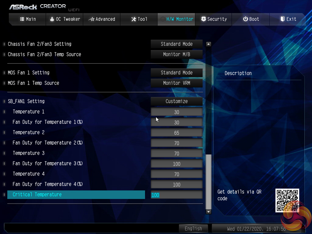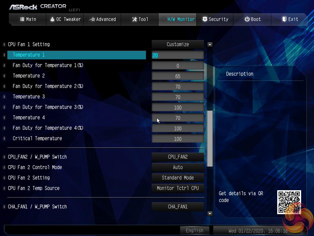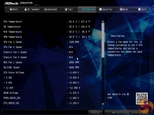 The fan options are plentiful with a variety of fan speed profiles but only CPU and motherboard temperature reading options. A user can set a well-tuned fan speed curve simply by opting for numerical inputs.