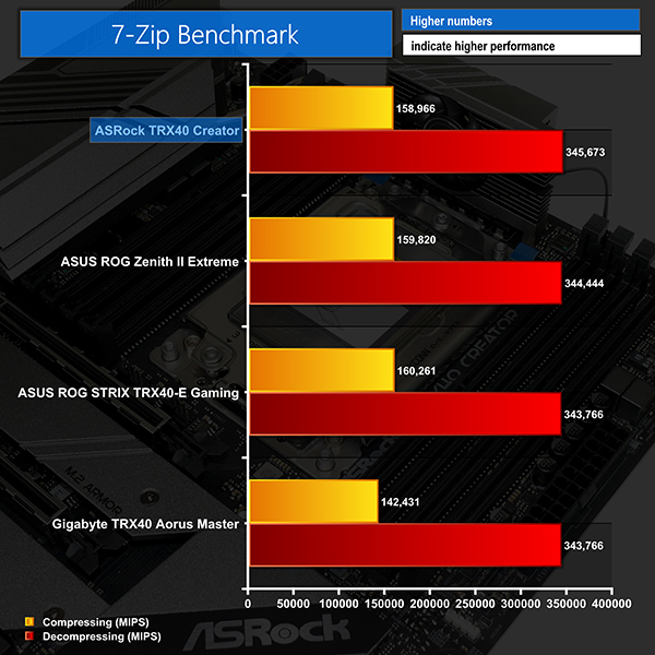 Alongside Blender and Cinebench, 7-Zip also delivered performance right in line with our expectations. This proves that ASRock’s boost clocks are working as intended for the TRX40 Creator and there is no concern with the memory subsystem’s performance.