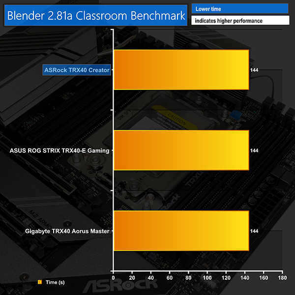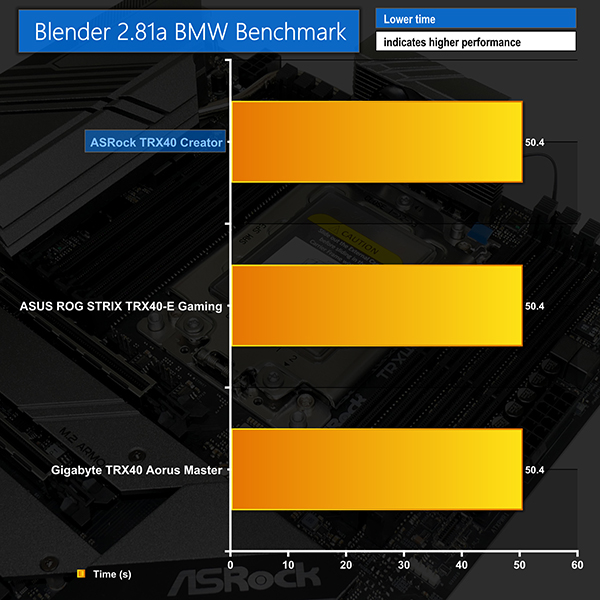 Blender also showed appropriate performance levels from the TRX40 Creator, thanks in large to the similar all-core boost frequencies that were achieved. We recorded the 3970X CPU operating around the mid-3800MHz mark during our Blender test runs.