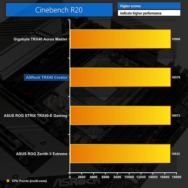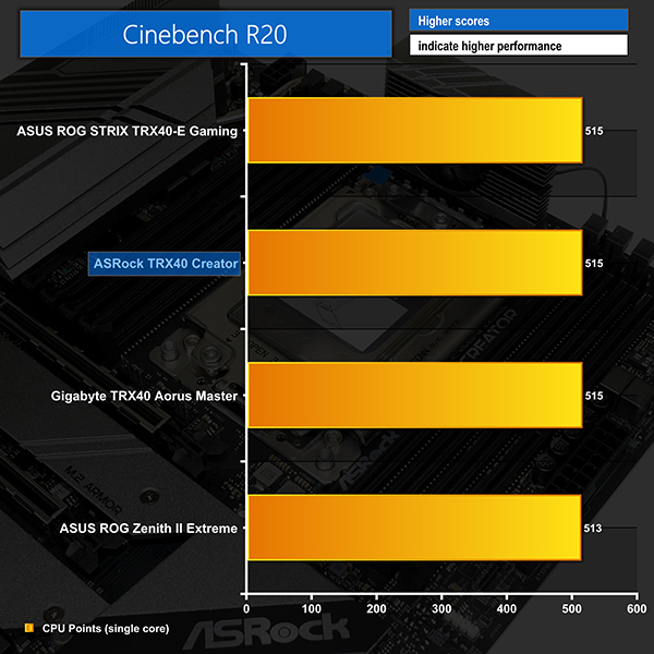 Cinebench runs as well as we would expect on the ASRock TRX40 Creator motherboard; the multi-threaded score is comparable to competing solutions at this price point. Meanwhile, the single-threaded result is also as good as other TRX40 options thanks to the ASRock board hitting maximum CPU boost clocks proficiently. All-core frequency was around 3850MHz (38.5x) to 3875MHz (38.75x) during the short-duration Cinebench nT runs.