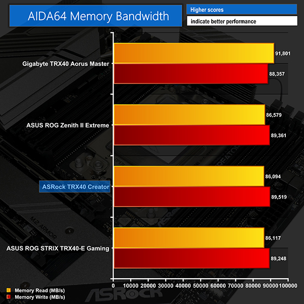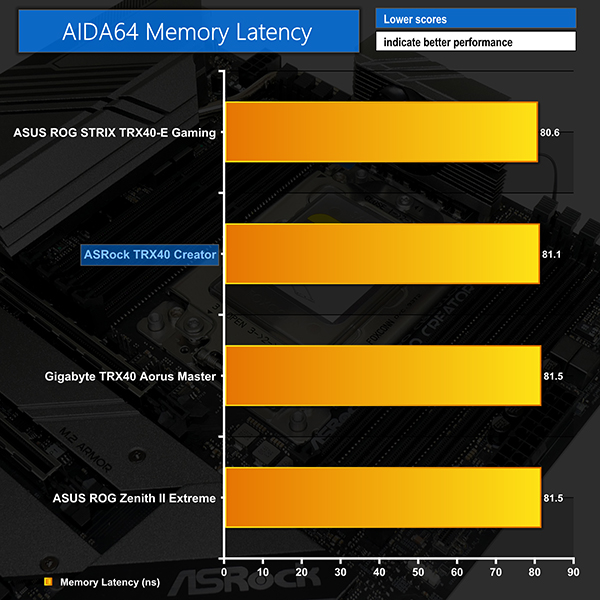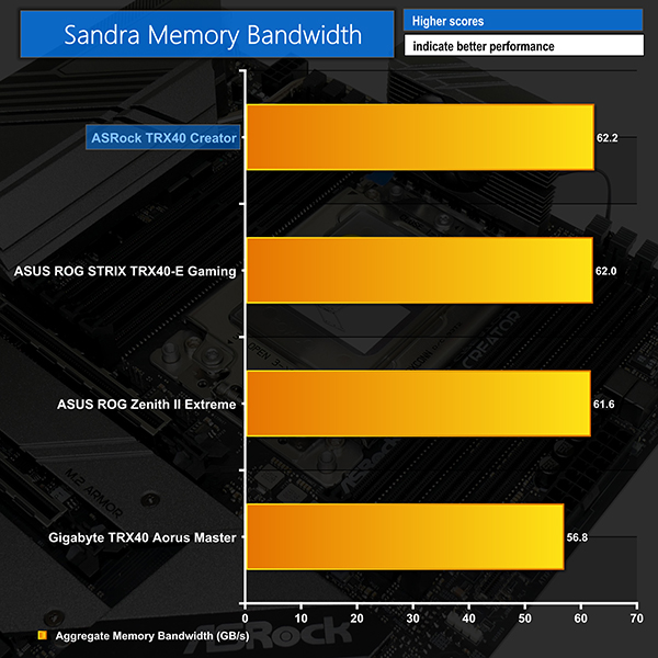 ASRock’s memory bandwidth results in AIDA64 are comparable to those from ASUS but cannot quite match the Gigabyte TRX40 Aorus Master. Switching to the SiSoft Sandra test, however, sees ASRock take the lead and deliver just over 62GBps of bandwidth with 3200MHz CL14 quad-channel modules.