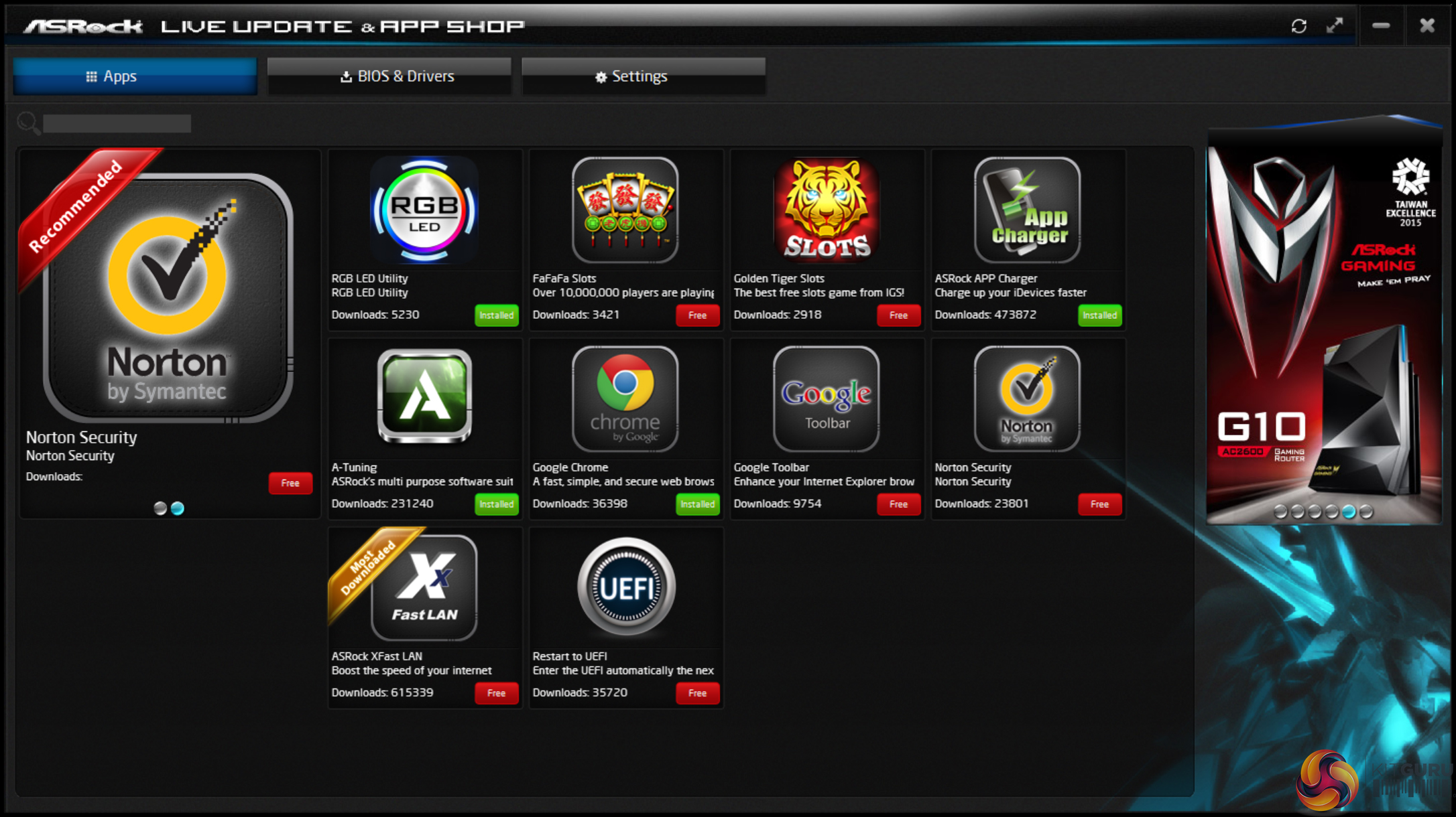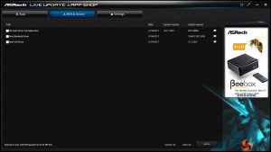 ASRock’s App Shop provides the dual role of serving out ASRock’s own software and approved third party software, but also includes a Live Update-style function which scans for certain BIOS and driver versions and informs the user when a newer version is available. It’s reasonably useful for both of its provided functions and isn’t too intrusive, but does pop up the occasional notification in Windows 10.