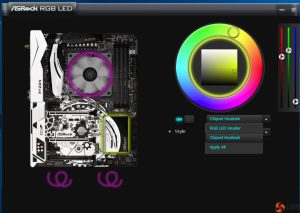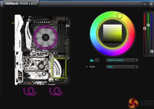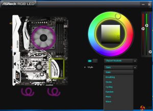 Users wanting to adjust colours of LEDs on the motherboard and those connected via the three strip headers will need to install ASRock RGB LED. The software tool provides colour control in a very annoying wheel and square mechanism that overcomplicates an otherwise simple procedure.