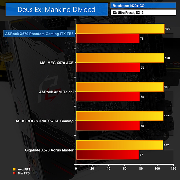 Despite its age, Deus Ex: Mankind Divided remains a demanding title even for modern hardware. We use the game’s built-in benchmark with quality set to Ultra, MSAA disabled, and DX12 mode.