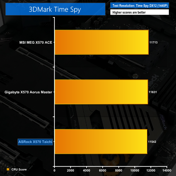 Surprisingly, given its higher boost clock frequencies through more aggressive CPU voltage, the X570 Taichi was a little slower than the rest in 3DMark Time Spy. The defeat is very narrow, however.