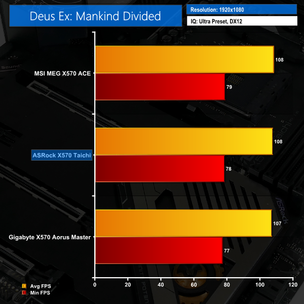 Clearly the 3DMark hiccup does not transfer into real world gaming performance, with ASRock’s X570 solution sitting close to the performance from MSI’s alternative in Deus Ex.