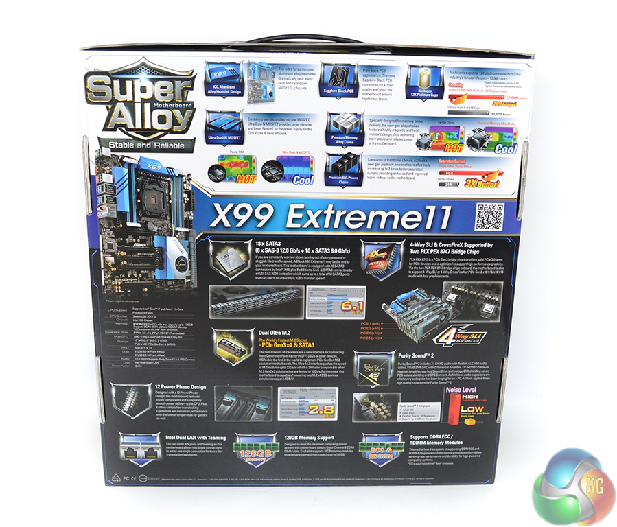 ASRock ships the X99 Extreme11 in the company's typical style of packaging. A few of the key features are outlined on the front of the box, while detailed specifications are highlighted on the rear.