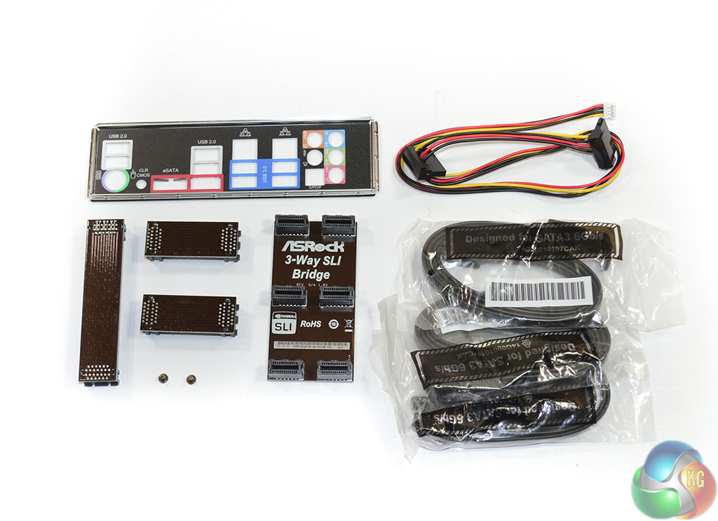 Six SATA cables and ASRock's HDD Saver cable form part of the bundle. Given the board's storage capacity, I am surprised to see fewer than ten SATA cables provided. Two screws are used to hold each of the potential M.2 devices in place. The rear IO shield is colour-coded to make finding the correct port in low-light conditions an easier task.