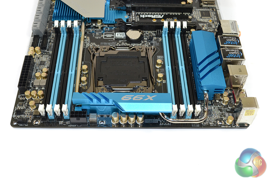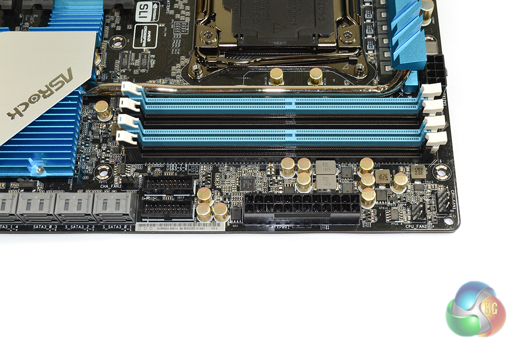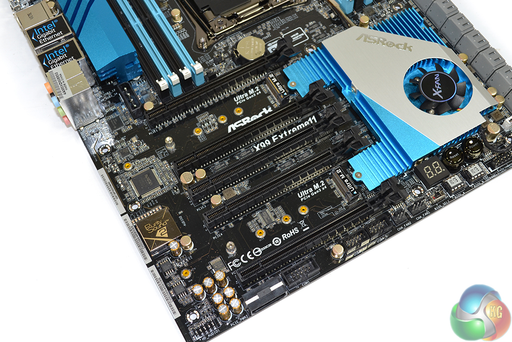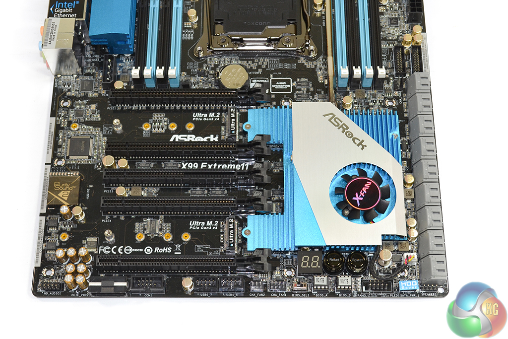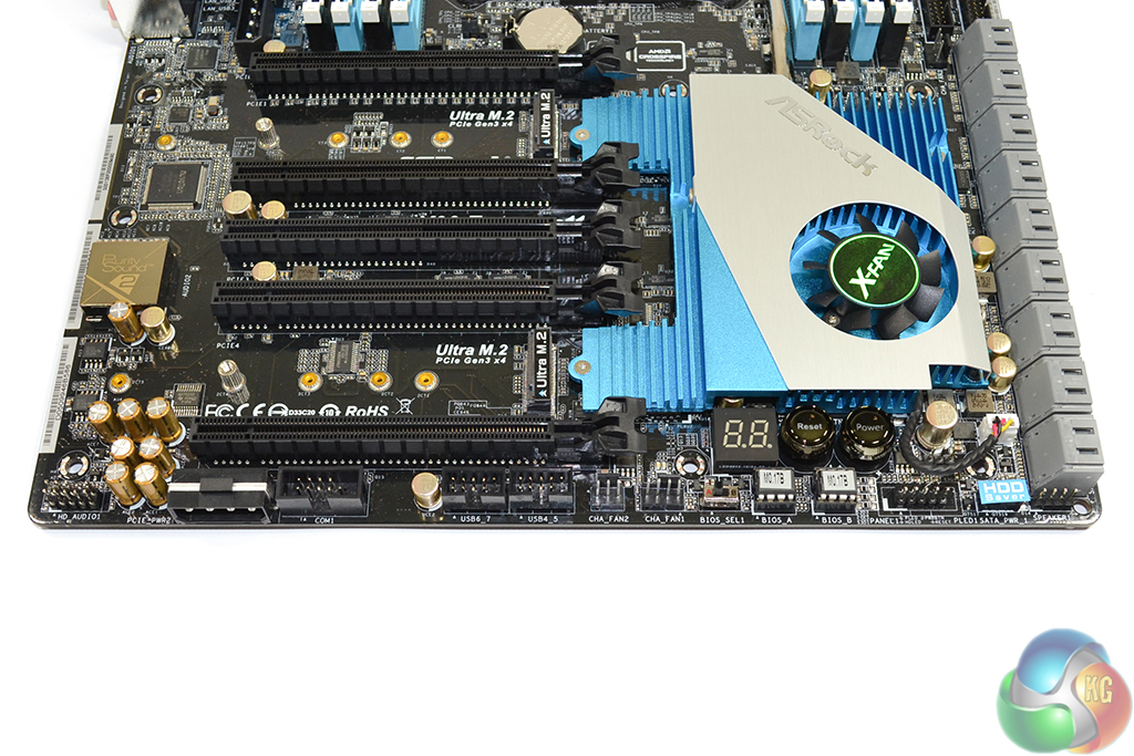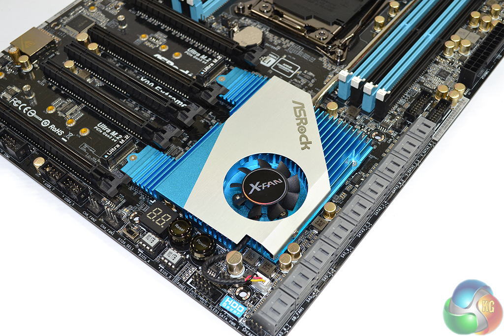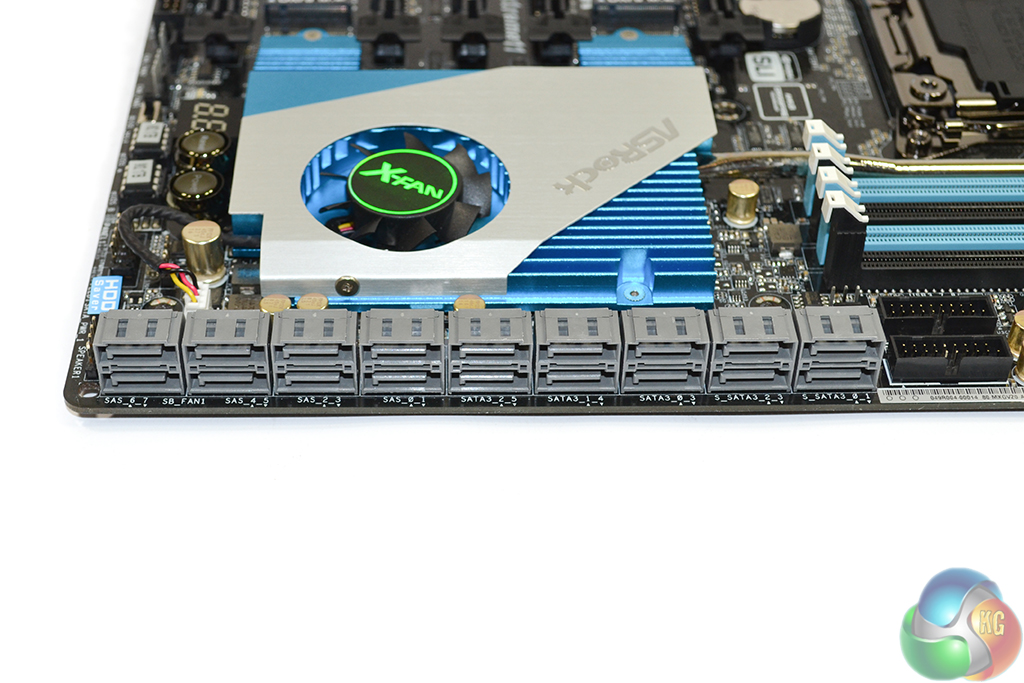 Covering the pair of PLX PEX8747 switches (which can drink up to 8W of power each) and the LSI SAS 3008 storage controller, not to mention the X99 PCH, ASRock is forced into using a sizeable, actively-cooled chipset heatsink.
