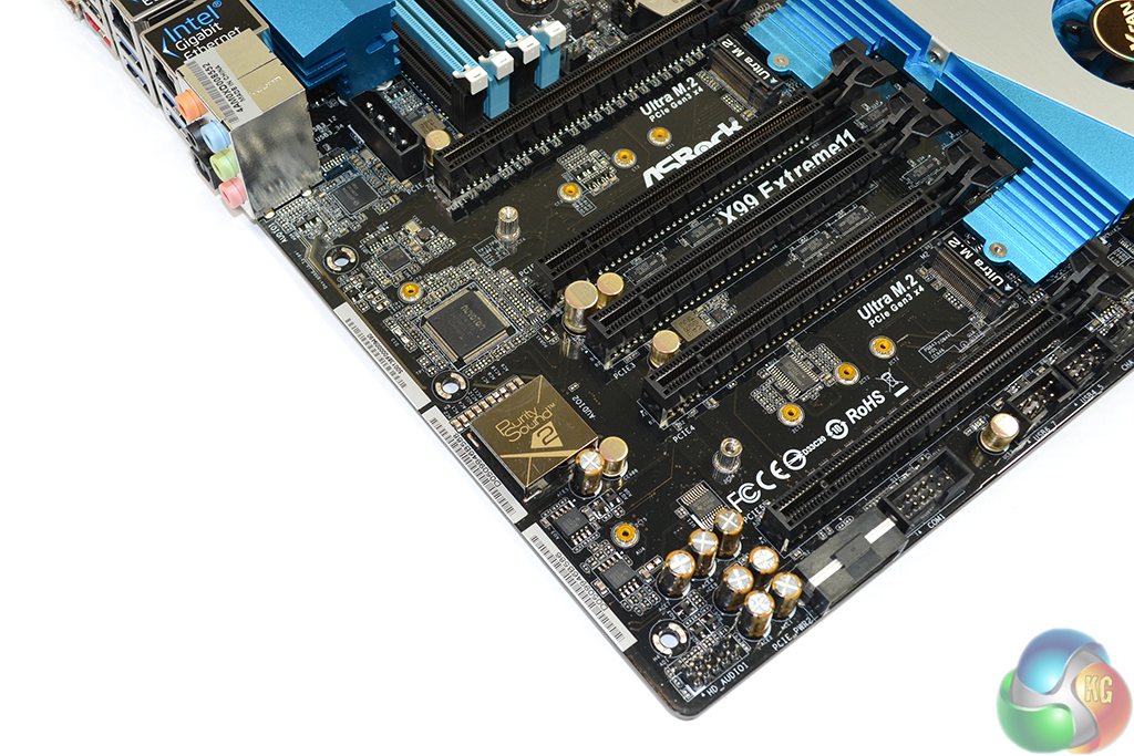 Two outwards-facing USB 3.0 headers provide a total of four SuperSpeed ports for front panel usage. To provide maximum bandwidth, ASRock does not use the popular ASM1074 bandwidth-dividing hub controller, instead opting to run each USB 3.0 connection directly from the X99 chipset.