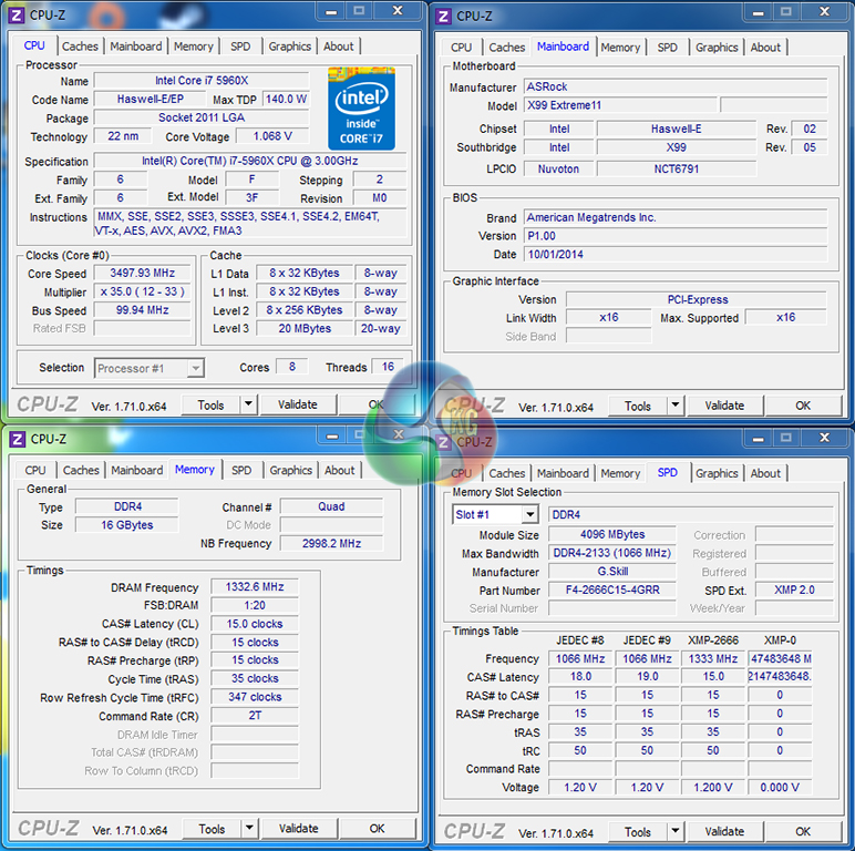 - Asus X99 Deluxe (BIOS 0801) – with 16GB (4x4GB) G.Skill Ripjaws4 3000MHz 15-15-15-35 DDR4 @ 1.35V.