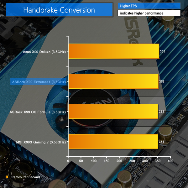 Handbrake sits the Extreme11 in second place, behind Asus' X99 Deluxe. Cinebench's result is only bested by MSI's X99S Gaming 7 and its higher processor clock.