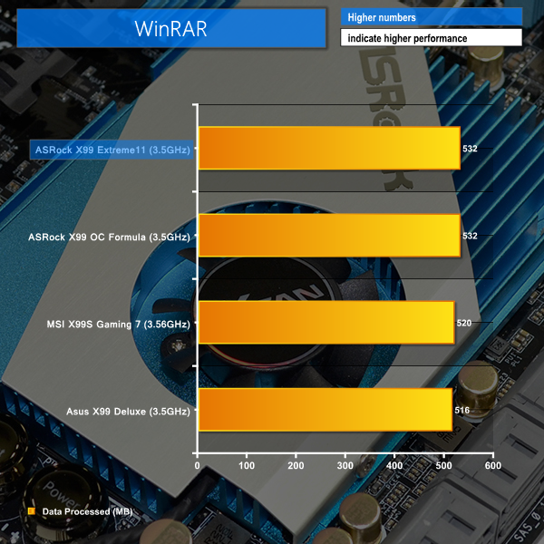 ASRock's X99 flagship continues to score well in our set of CPU-related tests. WinRAR performance is joint-best, along with the X99 OC Formula.