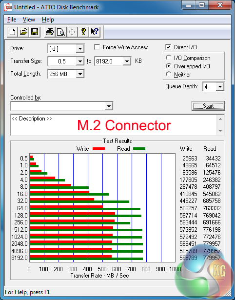The 32Gbps-capable Ultra M.2 connector has no problem providing ample bandwidth for our PCIe 2.0 x2 Plextor M6e SSD.