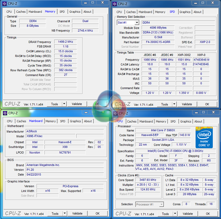 G.Skill's 3GHz Ripjaws4 DIMMs worked without hassle using the X99E-ITX/ac motherboard's XMP setting. The base clock was switched to 125MHz and CPU frequency was locked at 3.5GHz; however the CPU cache ran between 2750MHz and 2875MHz rather than the stock level of 3000MHz.