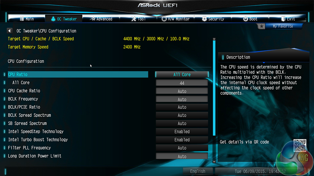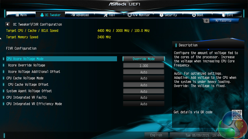 We increased the CPU VCore to 1.30V, and the CPU Input Voltage to 2.00V. Load-line calibration was set at level 1 to ensure consistent voltage, and the memory was manually set to 2400MHz.