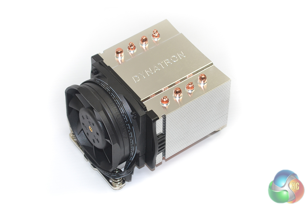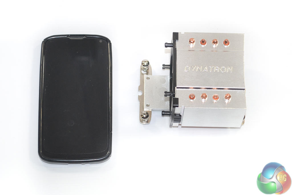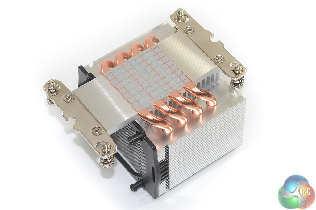 The heatsink has four heatpipes and a direct touch base. Clearly ASRock is happy enough with the cooler's performance to include it with a motherboard designed for up to 160W TDP Xeon chips, however given its dimensions similar to a 4.7″ smartphone, I would not feel comfortable increasing voltages with this unit.