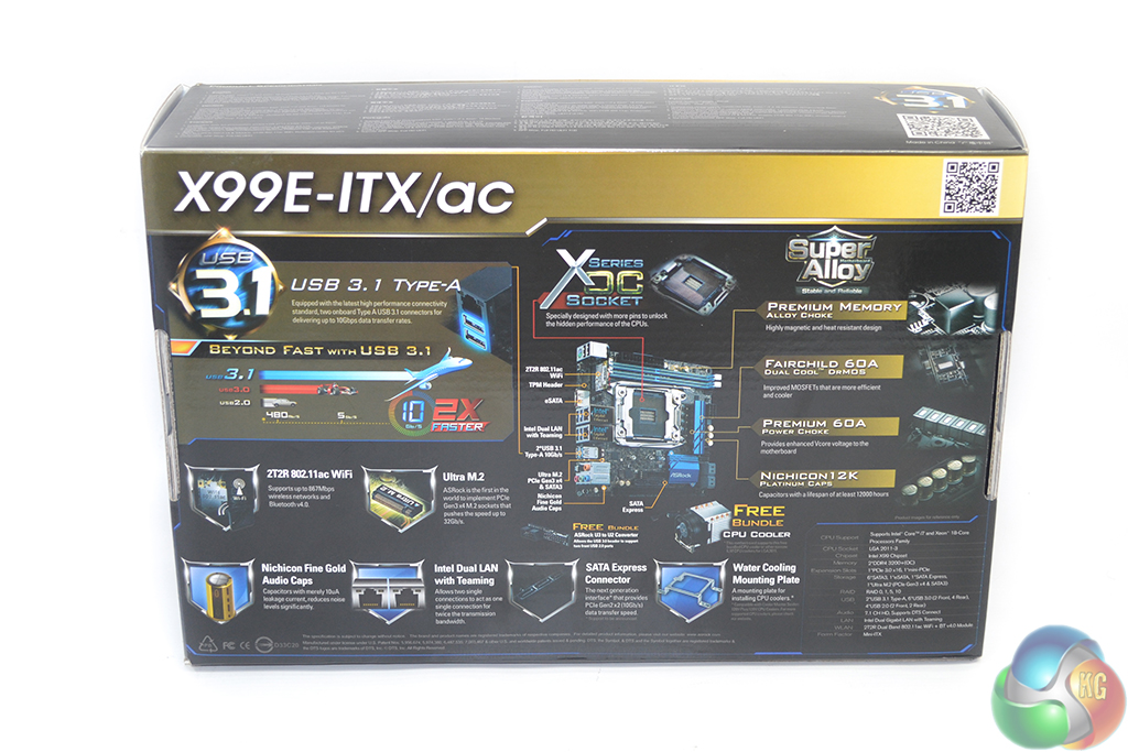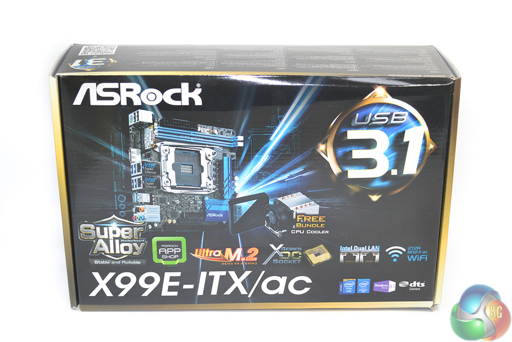 ASRock ships the X99E-ITX/ac motherboard in the company's usual style of packaging. Specifications and features are outlined on both sides of the box.