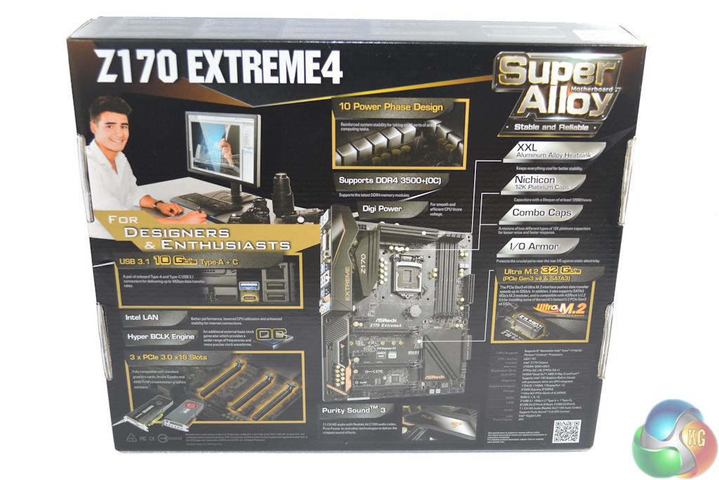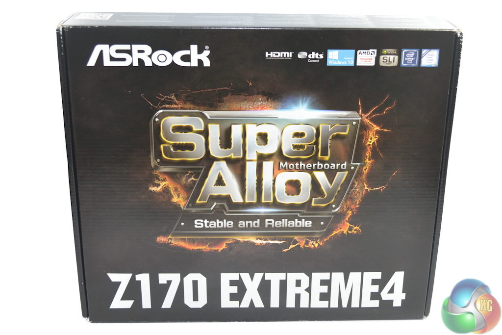 ASRock's Z170 Extreme4 ships in packaging that is typical for the company's ‘Extreme' series products. The front side features a graphic and clear interpretation of the name, whilst the rear is home to a densely-packed array of specifications and product features.