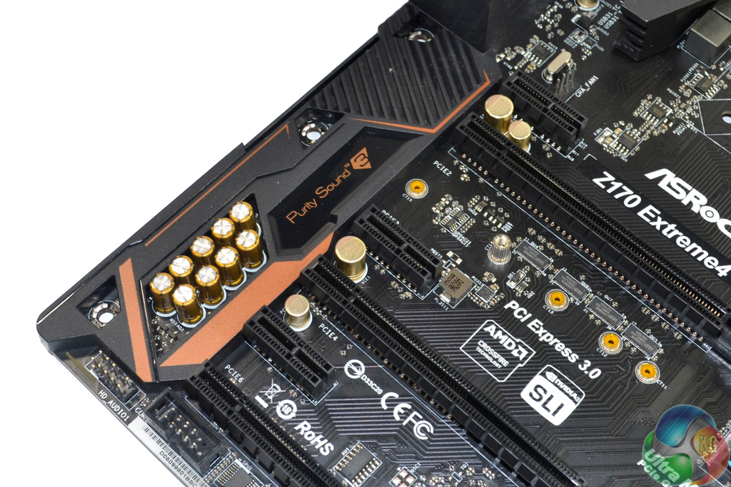 PCB segregation is used to separate the audio signals, however the Realtek ALC 1150 codec is deployed in an unshielded state – many motherboards ship with dedicated EMI shielding for the audio codec.