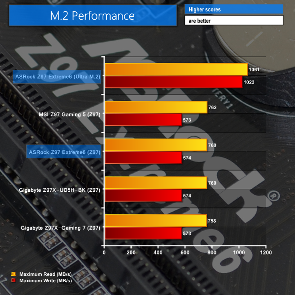 Providing a transfer rate of more than 1GBps, it is clear that ASRock has an impressive technology in Ultra M.2. For upcoming M.2 drives, the four-lane connection may be a smarter choice than Intel's bottlenecked two-lane, 10Gbps link.