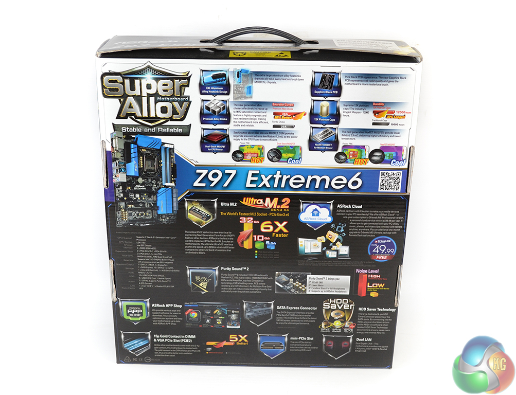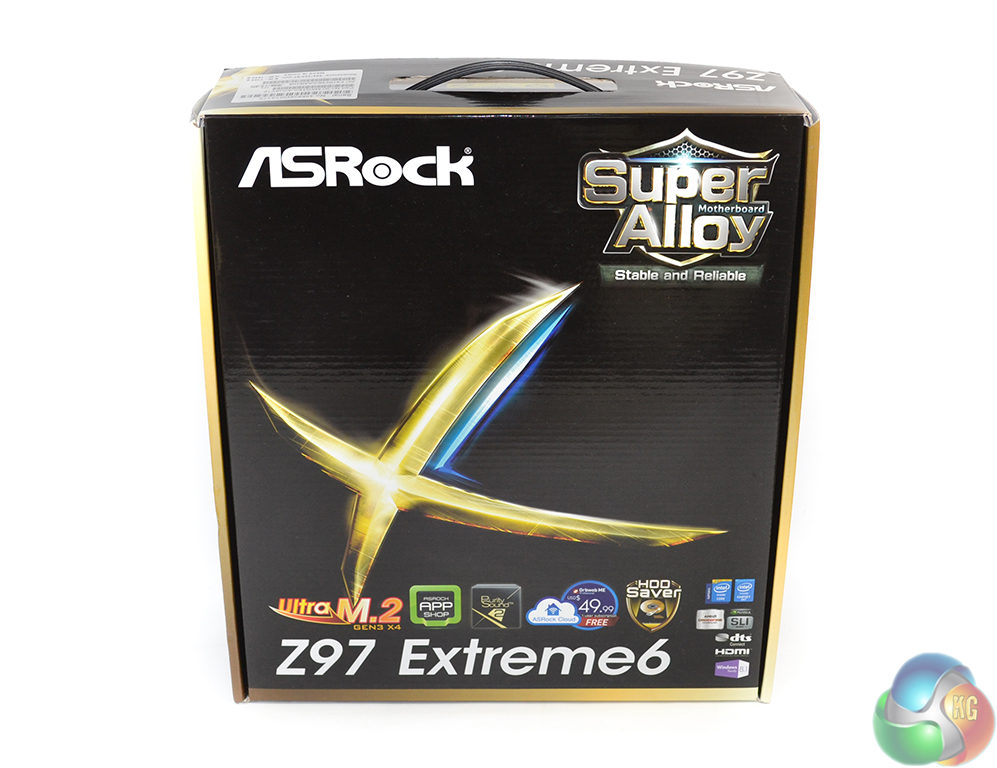 ASRock ships the Extreme6 motherboard in the company's typically-loud packaging. A graphic and some of the key features are shown on the box's front side, while detailed specifications are listed on the rear.