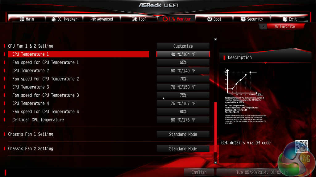 ASRock includes a balanced set of voltage, temperature, and fan speed readings on its HWMonitor page. Operation of the CPU and chassis fans can be set to pre-defined configurations via the BIOS, or a user can create their own profile.