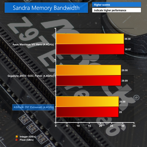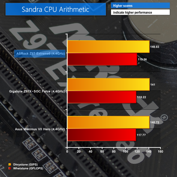 ASRock's Z97 Extreme6 makes a positive start in our system-related benchmarks. Chart-topping numbers are displayed in the 3DMark and Sandra processor arithmetic benchmarks.