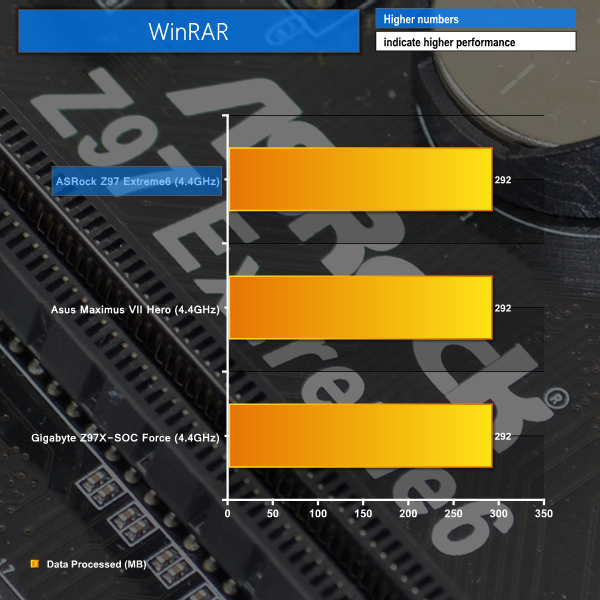 WinRAR’s built in benchmark and hardware test can help us outline the performance differentials between each motherboard. We record the amount of data processed after a 30-second run.