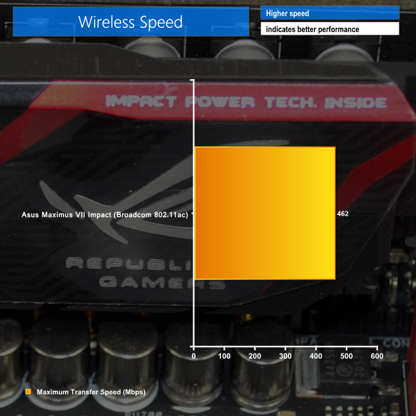 Testing the Maximus VII Impact's two-stream 802.11ac wireless connection over a short range shows impressive transfer rate numbers. Levels this high would translate into file copying speeds of around 80MBps, which is ideal if you transfer or (perhaps) stream large games over the network.