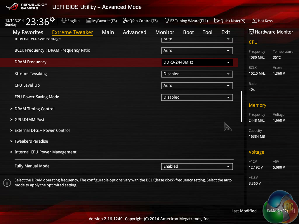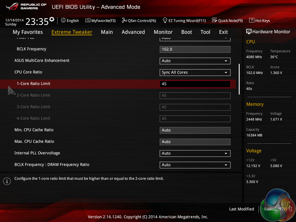 For the initial manual overclocking tests, we applied our typical range of CPU, cache, and input voltage levels. The Maximus VII Impact responded very badly to our settings, refusing to boot at more than 100MHz past the 4790K's 4.4GHz MCT frequency.