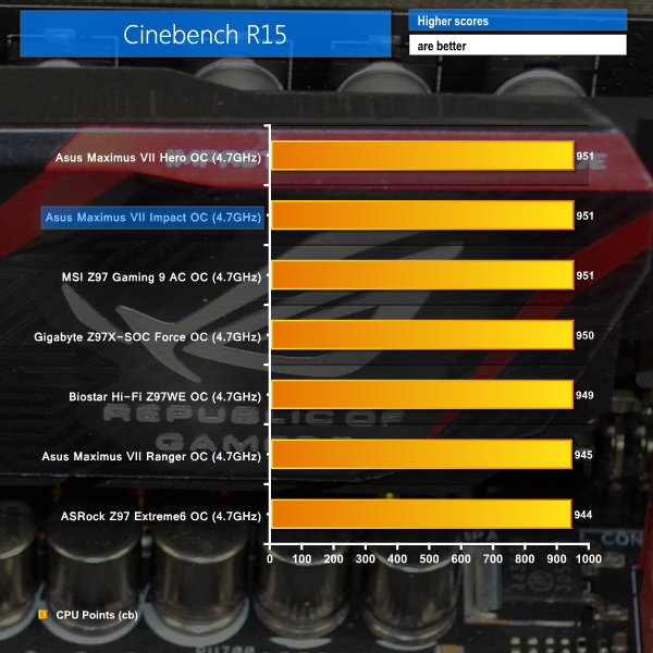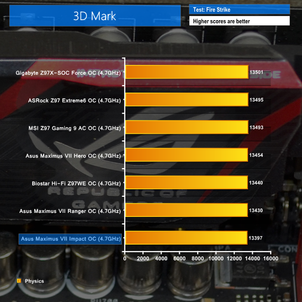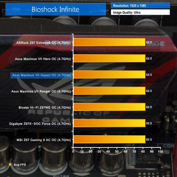 With the exception of a performance deficit in 3DMark's Physics test, the Maximus VII Impact responds well to a 300MHz boost in CPU frequency. The Cinebench and Bioshock Infinite results posted by the mITX board put it amongst the fastest cohort of Z97 parts.