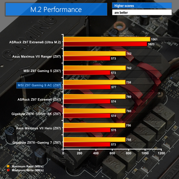 M.2 performance of each ROG board is similar to other Z97 parts when using Plextor's fast M6e SSD.