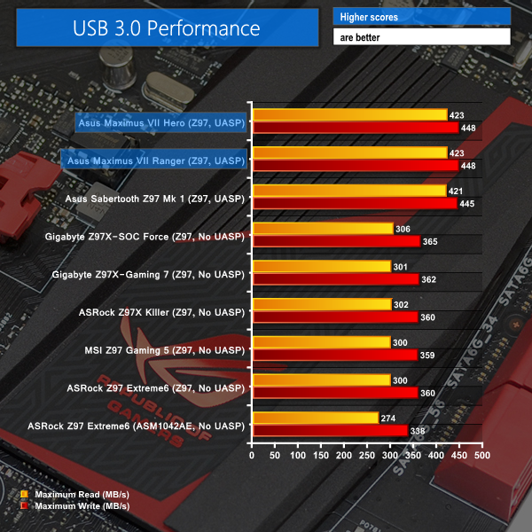 With their UASP-activating USB 3.0 Boost software, the Asus ROG boards are able to beat out all other contenders in USB 3.0 throughput numbers. Only Asus' own Sabertooth Z97 Mark 1 is able to keep relative pace in USB 3.0 speed.